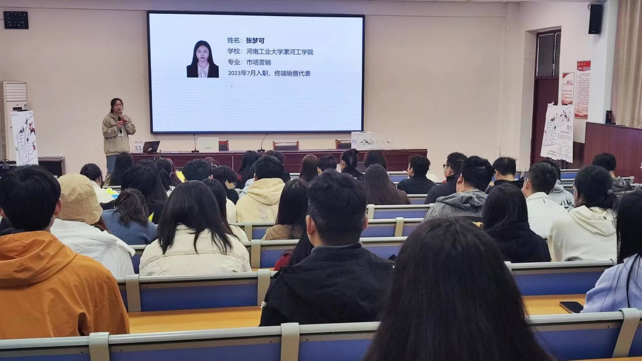 在宣讲会上,该公司河南终端周漯区域办事处总经理顾诺涵详细介绍了公司的发展历程、终端业务和零售业务岗位职责等。