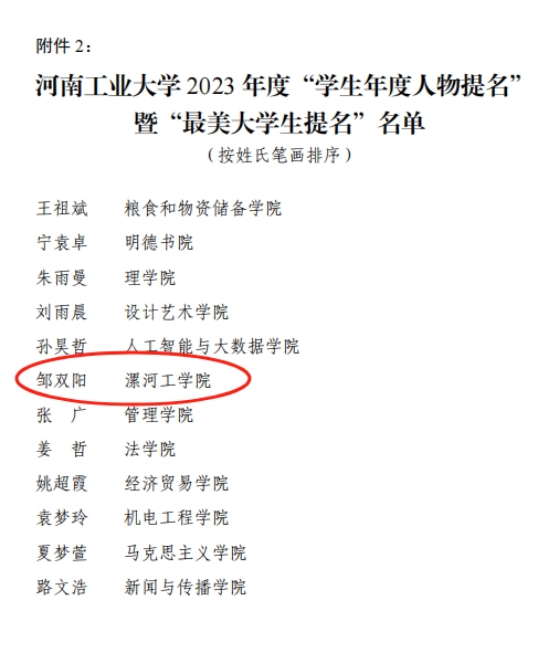 为充分展示青年学生积极进取、奋发向上的精神风貌,发挥新时代大学生先进典型的示范引领作用,近日,河南工业大学2023年度“学生年度人物”暨“最美大学生”校级评审展示会圆满举行。太阳成集团学生邹双阳获2023年度“学生年度人物提名”暨“最美大学生提名”荣誉称号。