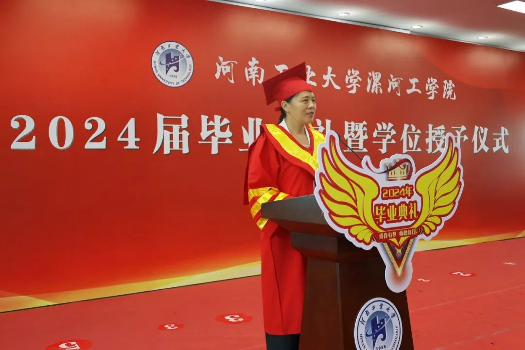 邢淑婕对学有所成、圆满毕业的同学们表示衷心的祝贺,对辛勤耕耘、匠心育人的老师们致以崇高的敬意,并对毕业生寄予四点期望:一要明德为先、立身固本,在将来的人生历程中明大德、守公德、严私德,让善良、诚实、正直的优秀品德伴随终生;二要求是务实、蔚为国用,始终保持终身学习的信念,永葆内心的求知欲,锤炼技能本领,更好服务经济社会发展;三要拓新立业、敢闯善创,始终保有创新思维、创新精神、创新本色,勤于思考、勇于实践,用青春的智慧去拥抱新时代;四要笃行不怠、自强不息,在新的人生赛道上,用实际行动践行“请党放心,强国有我”的铮铮誓言,以奋进者姿态助推中华巨轮劈波斩浪!