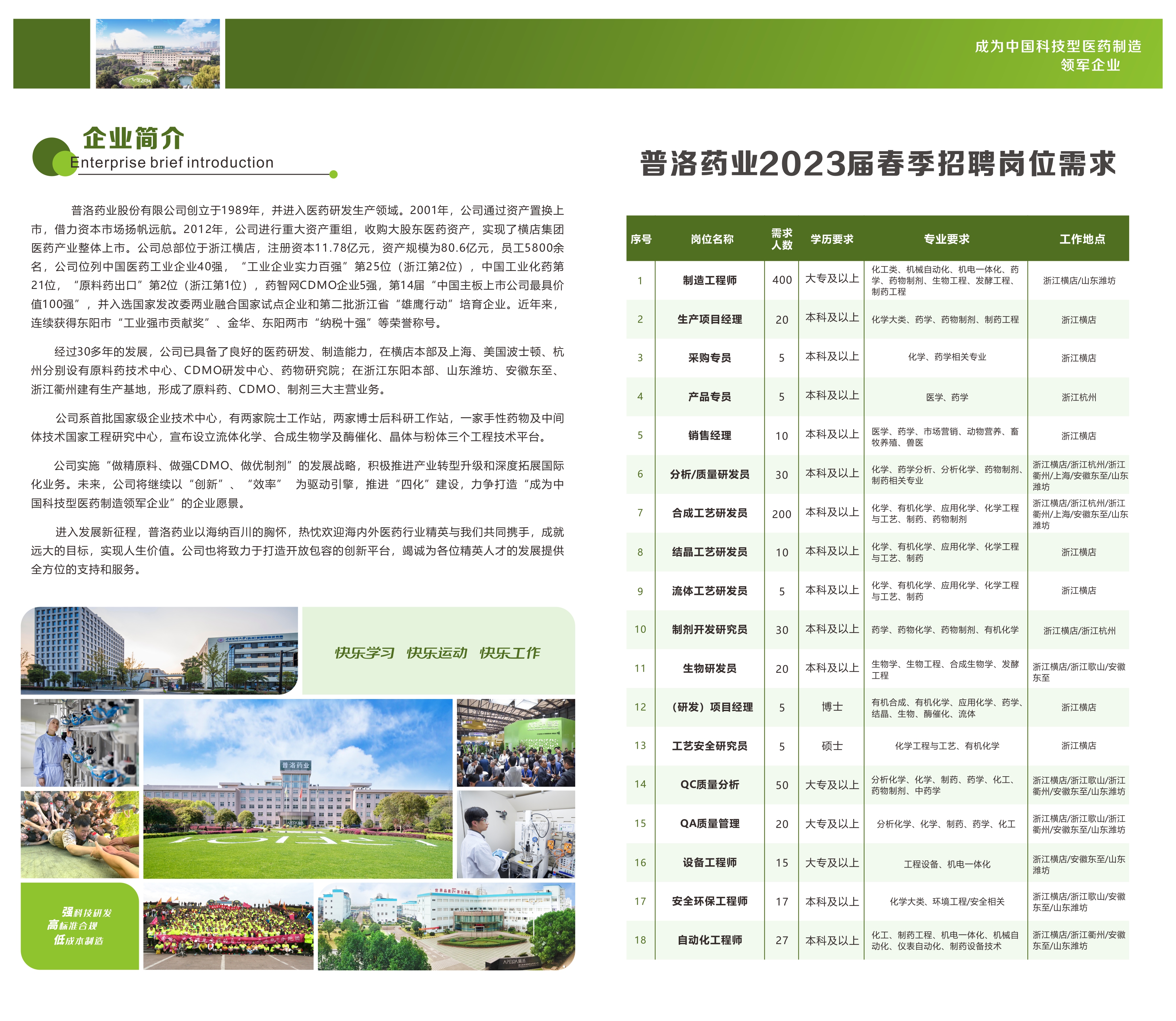 2023届普洛药业春季招聘信息