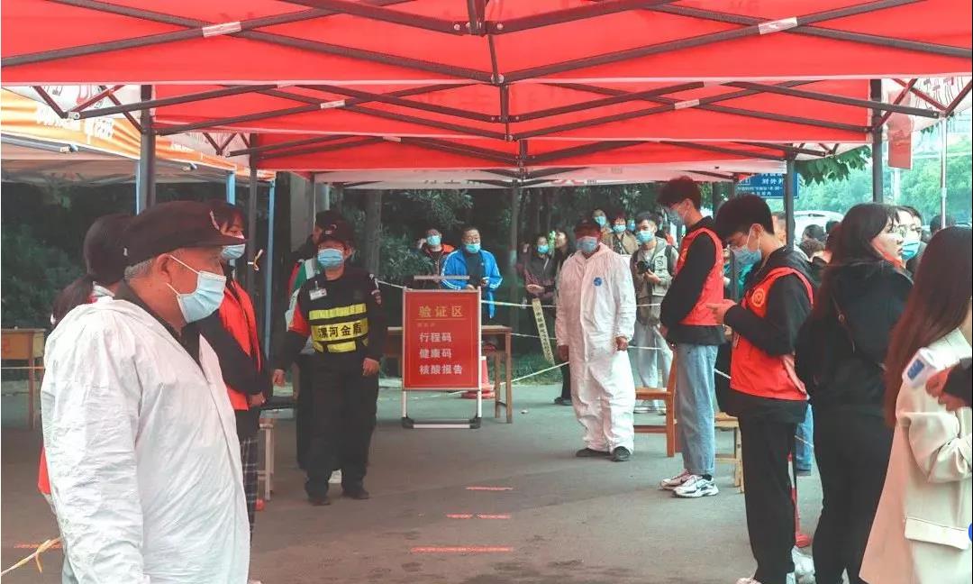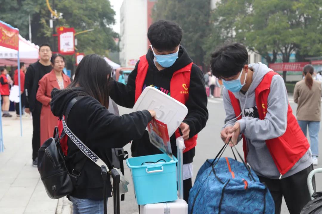在学校南门口报到现场,报到学生在工作人员指引下,严格按照学校疫情防控相关要求,保持安全距离,核验身份信息,出示行程码、健康码等相关证明材料,更换口罩,接受消毒、体温检测后,有序进入校园。师生志愿者、移动小车等将学生行李从校门口运送至宿舍区,解决了学生行李较多搬运不便的困扰。