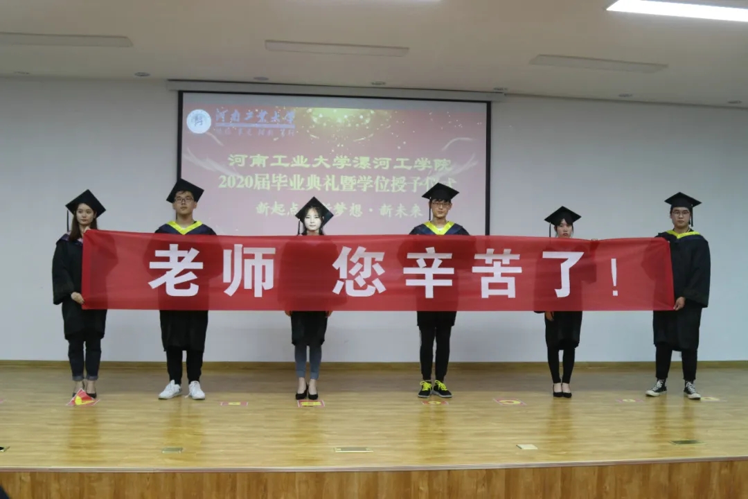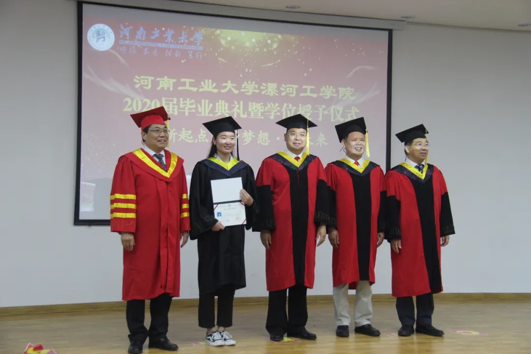 6月12日,tyc522cc太阳成集团举行2020届本科生毕业典礼暨学位授予仪式,庆祝首届85名本科生顺利毕业。河南工业大学副校长陈复生教授,tyc522cc太阳成集团党委书记顾文明教授、校长王春阳教授,河南工业大学教务处处长杨六栓教授,tyc522cc太阳成集团纪委书记薛存心,副校长朱晓红、王变奇、代骅,工会主席吕爱华,各处室、院系负责人,2020届全体毕业生、师生代表以及新闻媒体的朋友参加活动。毕业典礼由纪委书记薛存心主持。