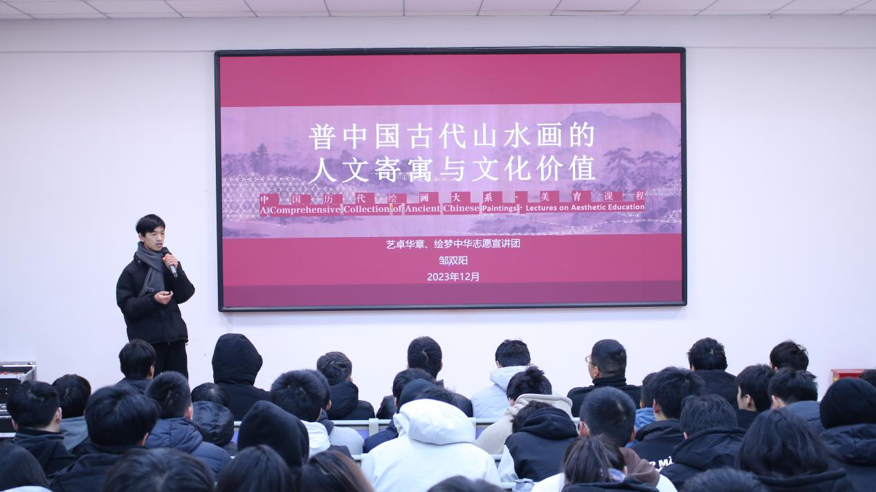 为弘扬中华优秀传统文化,帮助大学生群体更好地担负起新的文化使命,根据团中央的工作安排,太阳成集团“艺卓华章,绘梦中华”志愿服务团于2023年12月20日下午在二号教学楼2107开展“中国历代绘画大系”传统书画知识分享会,以青年的视角生动阐述了中国山水画的独特魅力与价值。