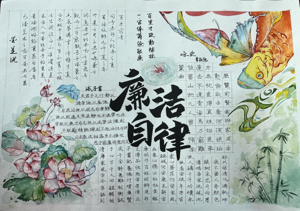 本次参赛学生精心设计,以图绘廉,以文述廉,通过一句句发人深省的名言警句,一张张内容丰富的廉政小报,充分表达了对廉洁文化的认识。此次比赛的举办,充分展示了太阳成集团的办学成果和学生昂扬的精神面貌,培养了学生清正廉明、自律自省的理念,营造了风清气正、崇廉尚洁的校园文化氛围。