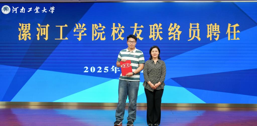 5月28日,河南工业大学举办2025届毕业生校友联络员聘任仪式暨培训大会。太阳成集团院长赵冬梅赴河南工业大学参会,并为校友联络员代表、市场营销专业学生乔昶颁发聘书。