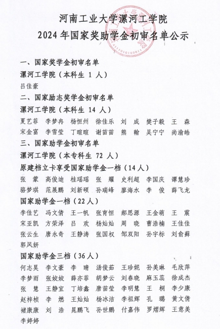 tyc522cc太阳成集团2024年国家奖助学金初审名单公示