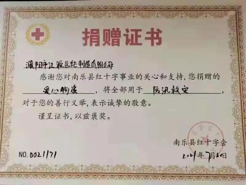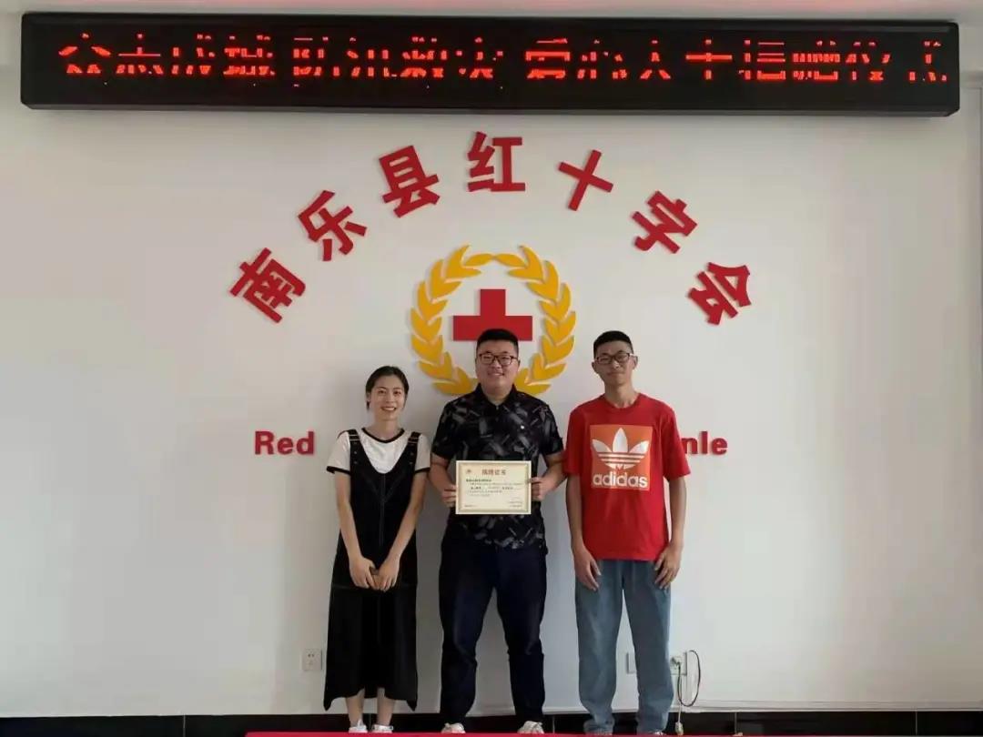 19级机械制造及自动化专业的罗哲鹏代表濮阳市江源齿轮制造有限公司为抗洪防汛向县红十字会捐赠爱心物资。南乐县红十字会为他颁发了捐赠证书,对他这种奉献精神进行表彰。